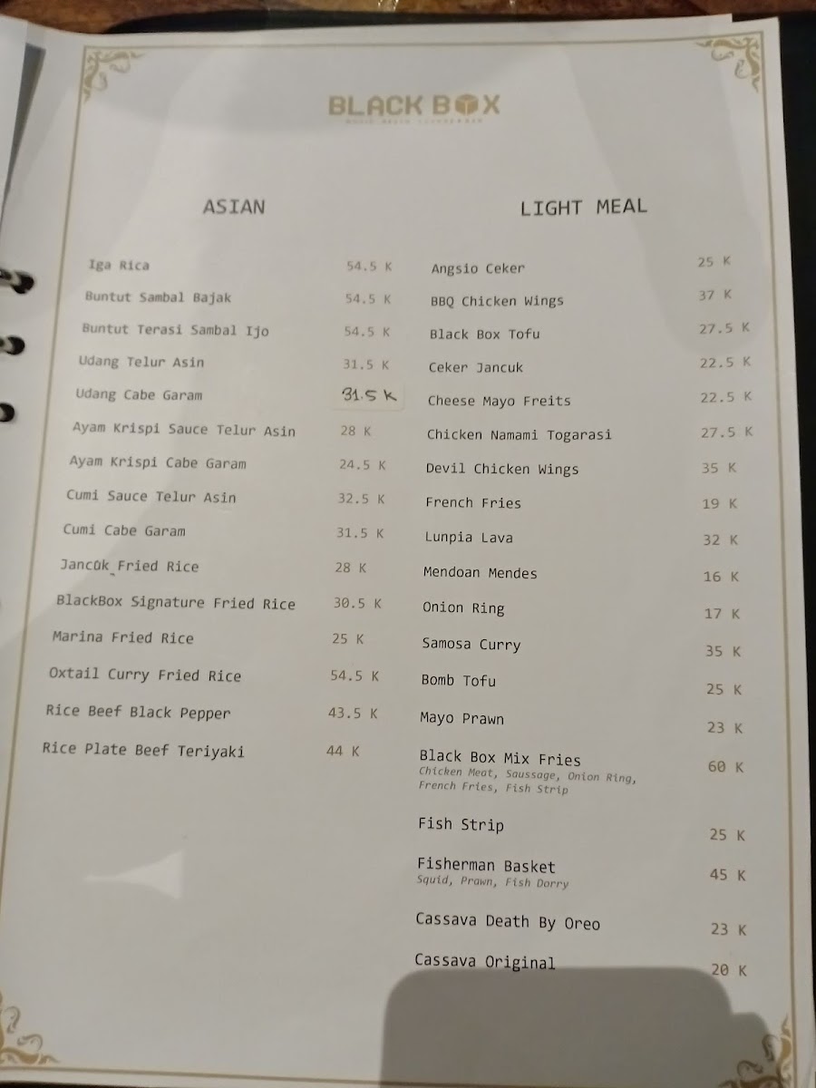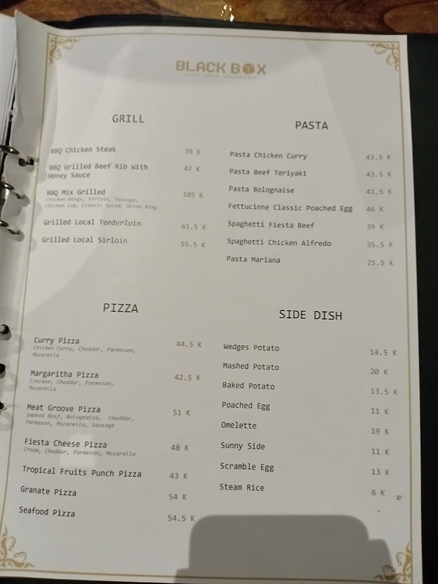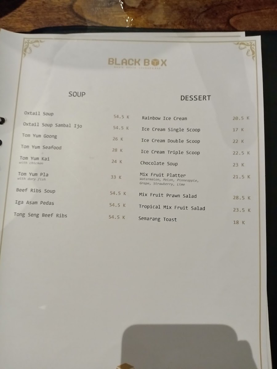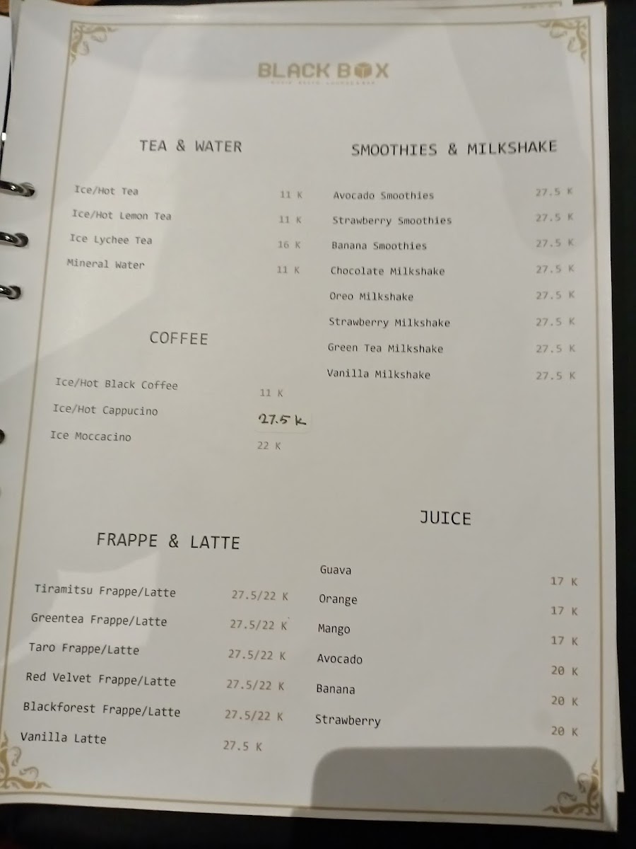 The menu features local favorites like Soto Kudus, Bakwan Jagung, and Perkedel Kentang, which have garnered rave reviews for their flavors. Whether you're looking for a quick bite or a filling dinner, Black Box has something for everyone.